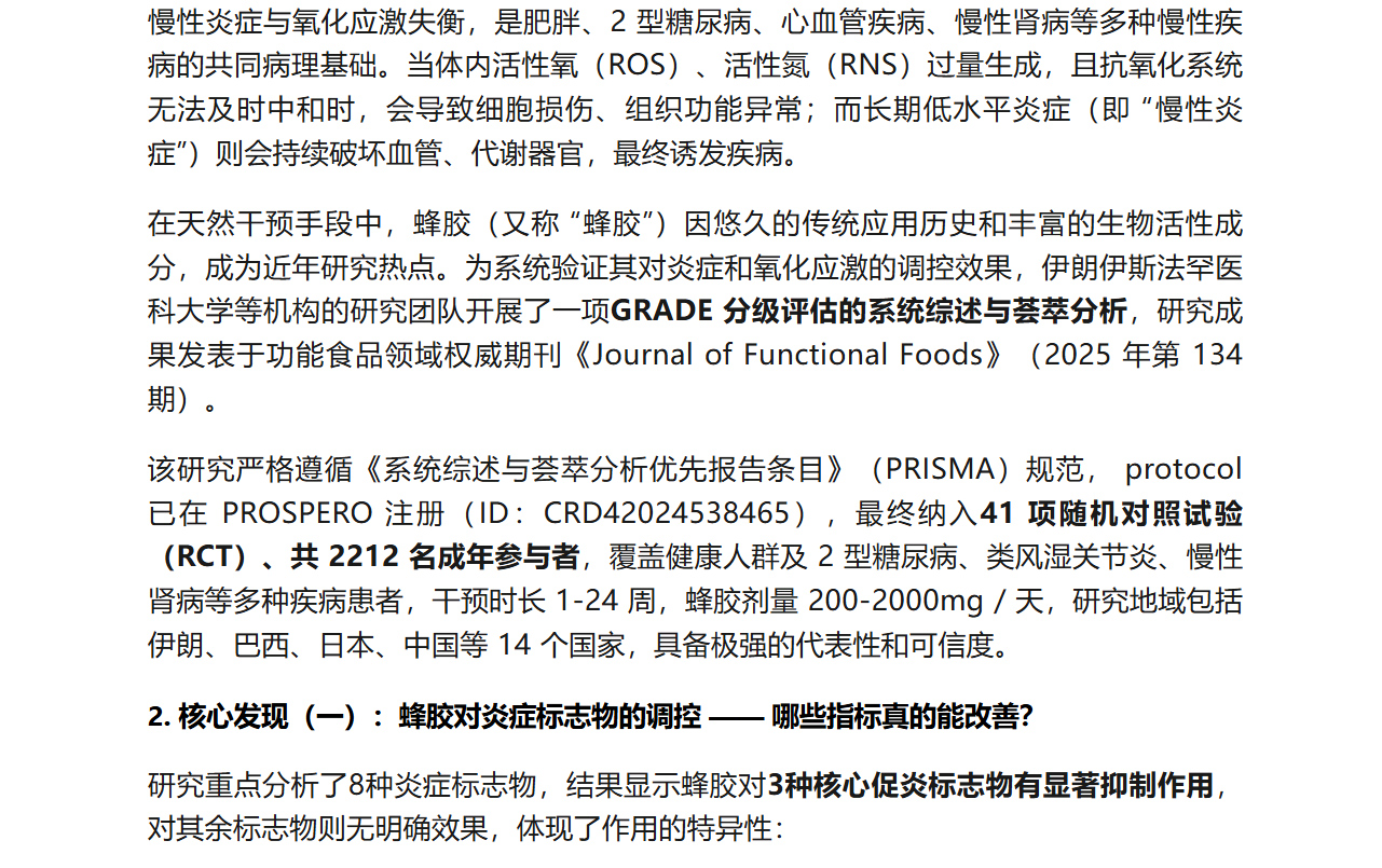 蜂膠與炎癥、氧化應(yīng)激:基于 41 項(xiàng)臨床試驗(yàn)的權(quán)威科普解析