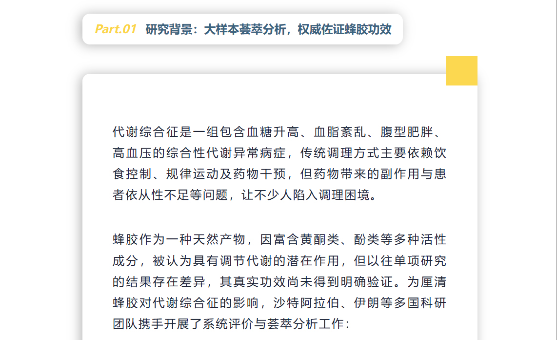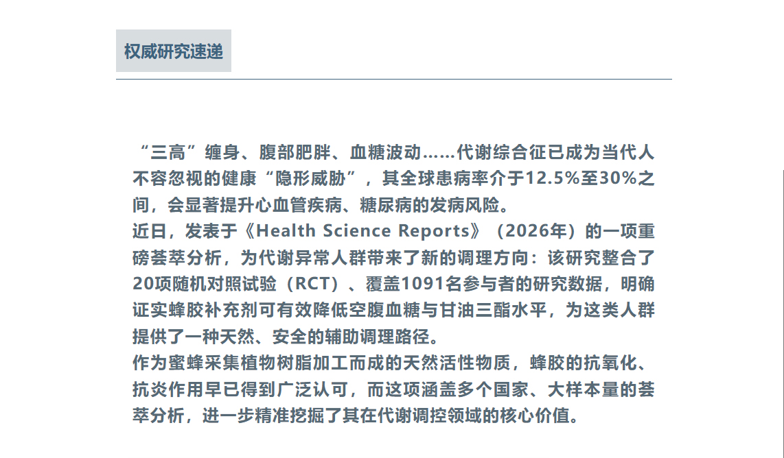蜂膠科研再出新成果!20 項臨床試驗證實調(diào)控血糖血脂精準,代謝綜合征人群新福音